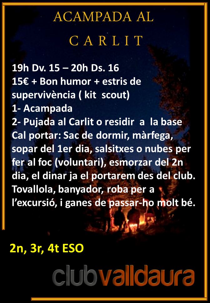 Cal portar: Sac de dormir, màrfega, sopar del 1er dia, salsitxes o nubes per fer al foc (voluntari), esmorzar del 2n dia, el dinar ja el portarem des del club. Tovallola, banyador, roba per a l’excursió, i ganes de passar-ho molt bé.