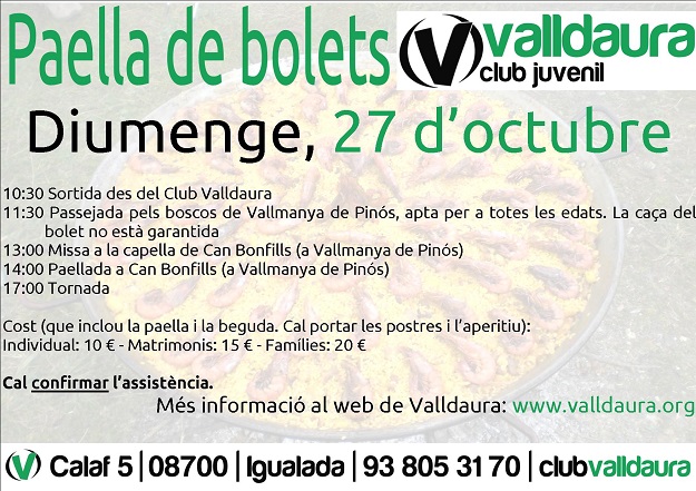 El proper diumenge, 27 d'octubre realitzarem la sortida familiar del primer trimestre d'aquest curs. Inicialment havíem previst fer una sortida per cercar bolets. La manca de pluja ens ha propiciat canviar el contingut inicial de la sortida. Mantindrem el passeig pel bosc i també la paella, però no garantim la trobada de bolets.